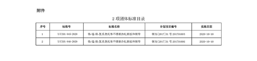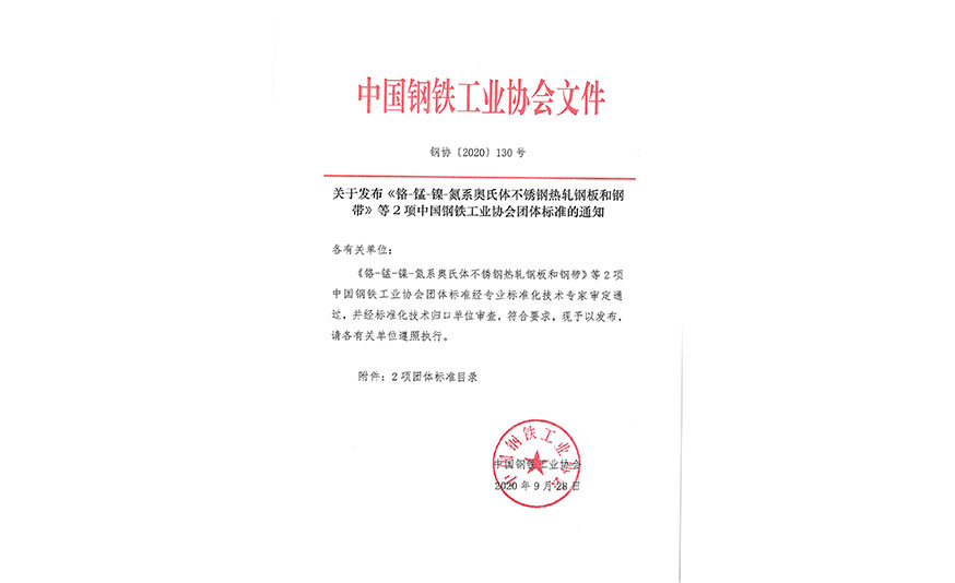 9月28日,中国钢铁工业协会下发《关于发布<铬 -锰-镍-氮系奥氏体不锈钢热轧钢板和钢带>等2项中国钢铁工业协会团体标准的通知》(钢协﹝2020﹞130号文件)。中国钢铁工业协会和冶金工业信息标准研究院主导,青拓集团、太钢、宝钢等16家单位联合起草的《铬 -锰-镍-氮系奥氏体不锈钢热轧钢板和钢带》《铬 -锰-镍-氮系奥氏体不锈钢冷轧钢板和钢带》等2项标准将于2020年10月10日正式执行。