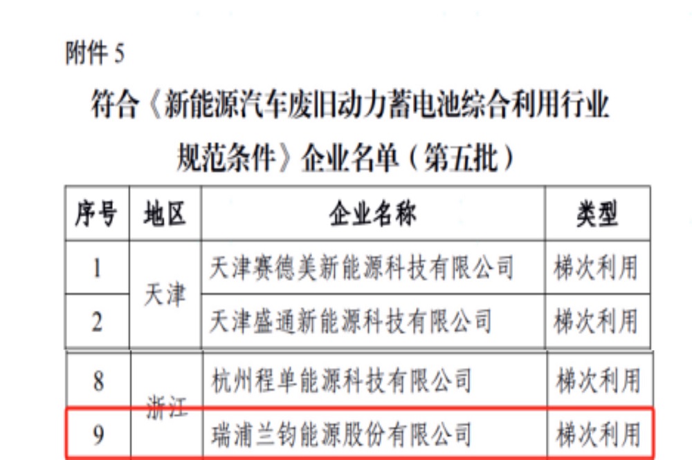 1月17日,中华人民共和国工业和信息化部发布符合《新能源汽车废旧动力蓄电池综合利用行业规范条件》企业名单(第五批),瑞浦兰钧能源股份有限公司成功获得新能源汽车废旧动力蓄电池梯次利用资质。