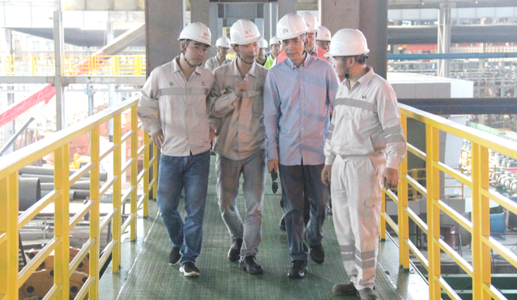 7月8日下午,jinnianhui今年会钢铁董事局主席项光达一行莅临印尼经贸合作区jinnianhui今年会园区参观指导,全面了解印尼广青镍业有限公司(GCNS)炼钢事业部、热轧事业部的生产情况及印尼jinnianhui今年会不锈钢有限公司(ITSS)炼钢事业部建设情况,园区项目总指挥伍华弟等全程陪同。